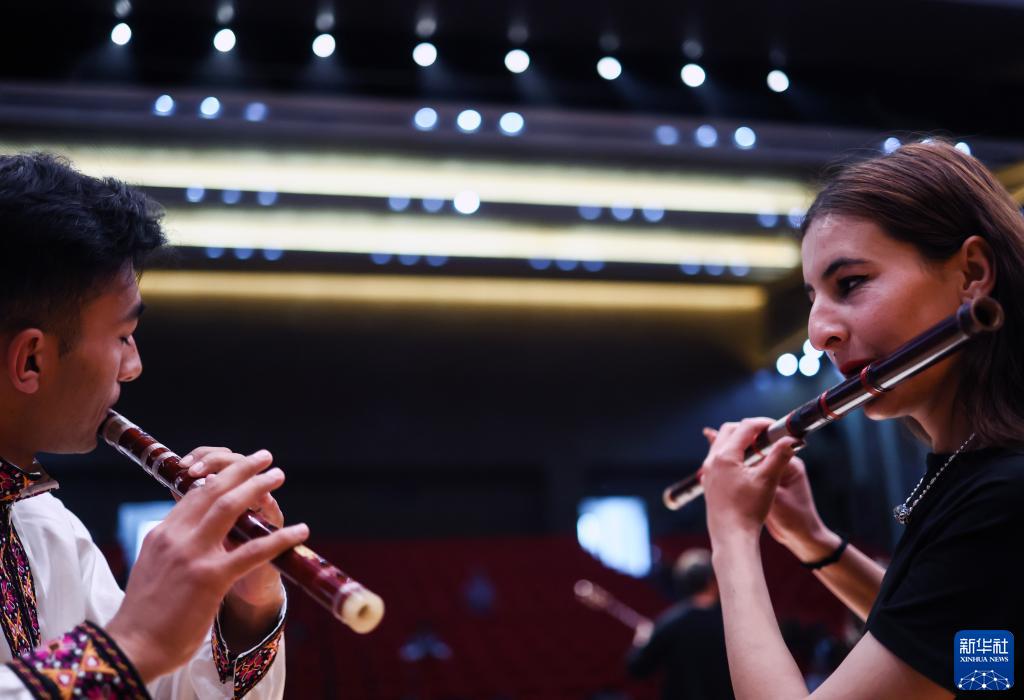 新疆塔縣文工團樂(lè )手美麗卡·依沙克(右)和同伴一起排練器樂(lè )演奏節目《絲路遺夢(mèng)》(9月4日攝)。新華社記者 蘭紅光 攝