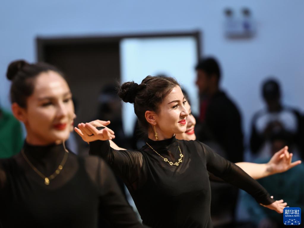 新疆塔縣文工團舞蹈演員古麗巴努爾·庫爾恰克(右)和同伴在排練鷹舞節目《傳承》(9月4日攝)。新華社記者 蘭紅光 攝