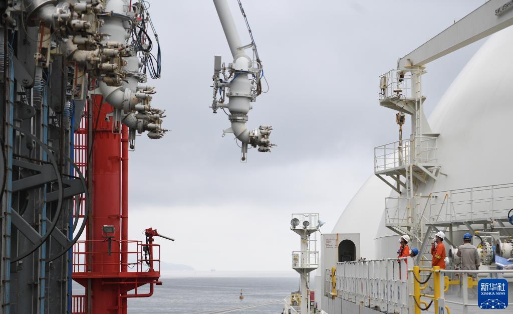 9月7日,廣東大鵬液化天然氣(LNG)接收站工作人員操作卸料臂與“能量自信”號運輸船對接。