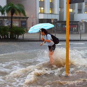 9月8日,一名女士在香港皇后大道東路段涉水前行。