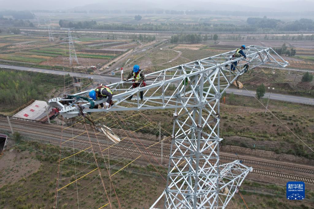 9月8日,工人在武威市天??h境內的蘭新(張)三四線(xiàn)甘肅牽引站330千伏外部供電工程施工現場(chǎng)作業(yè)(無(wú)人機照片)。