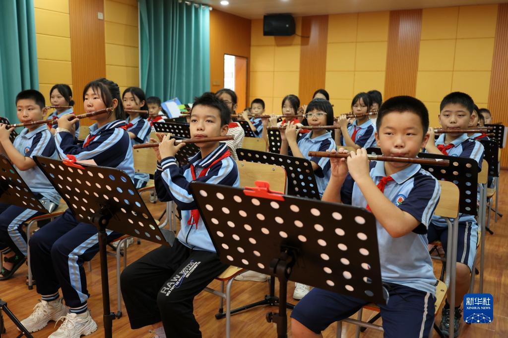 在江西省吉安市泰和縣水槎鄉中心小學(xué),竹笛班的孩子們在上演奏課(9月5日攝)。