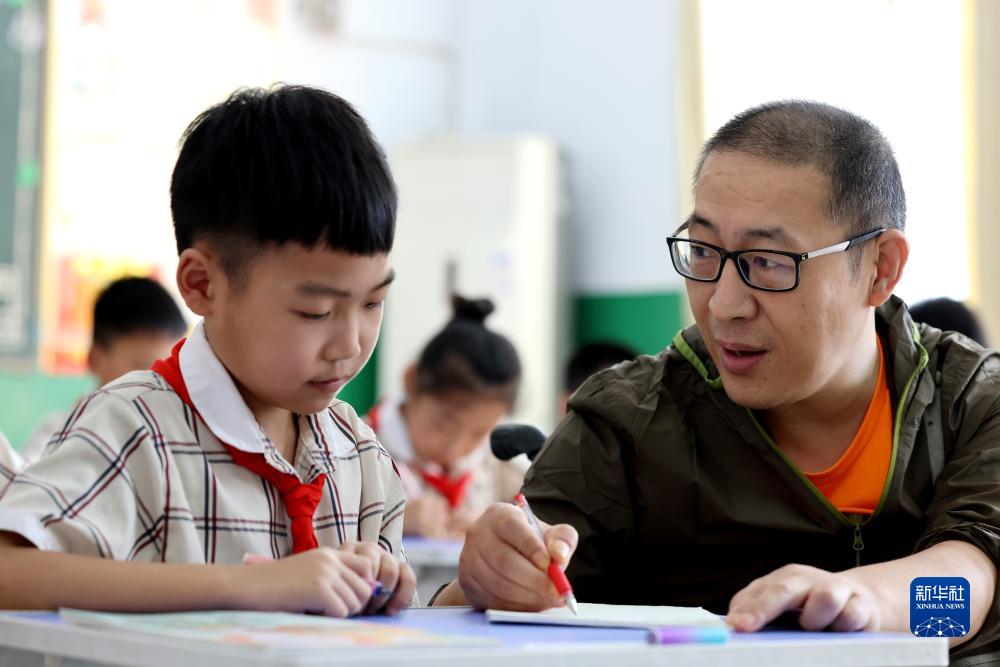 9月5日,在山東省棗莊市永安鎮遺棠小學(xué),楊季剛在輔導四年級學(xué)生英語(yǔ)。