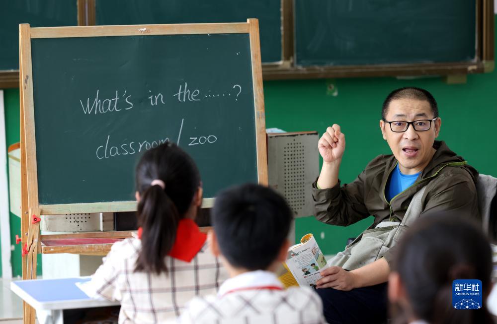 9月6日,在山東省棗莊市永安鎮遺棠小學(xué),楊季剛給四年級學(xué)生上英語(yǔ)課。