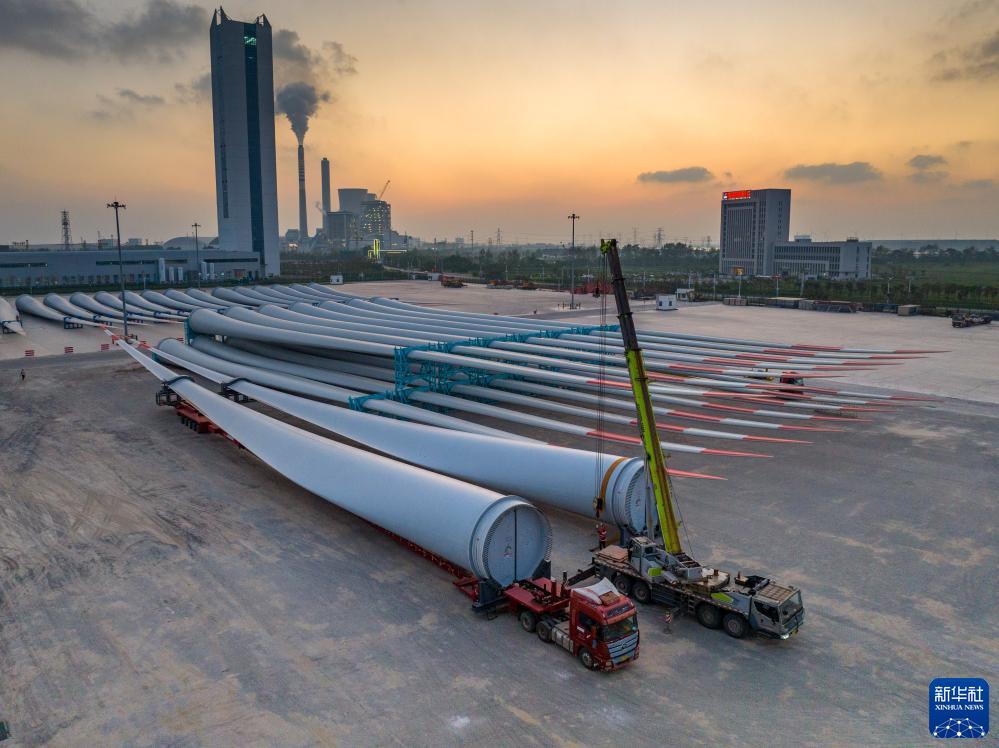 一批風(fēng)電葉片在江蘇鹽城港射陽(yáng)港區碼頭等待運輸(9月7日攝,無(wú)人機照片)。