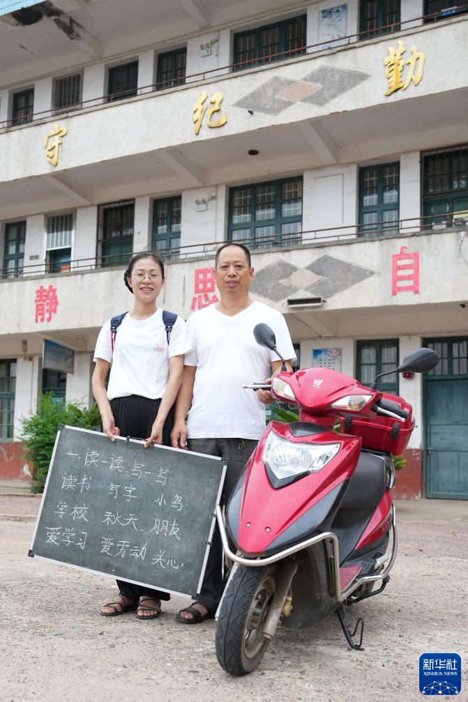 9月7日,陳艷輝(左)和父親陳二文拿著(zhù)上門(mén)送教時(shí)使用的小黑板在湖南省株洲市界首中心小學(xué)白洲教學(xué)點(diǎn)留影。