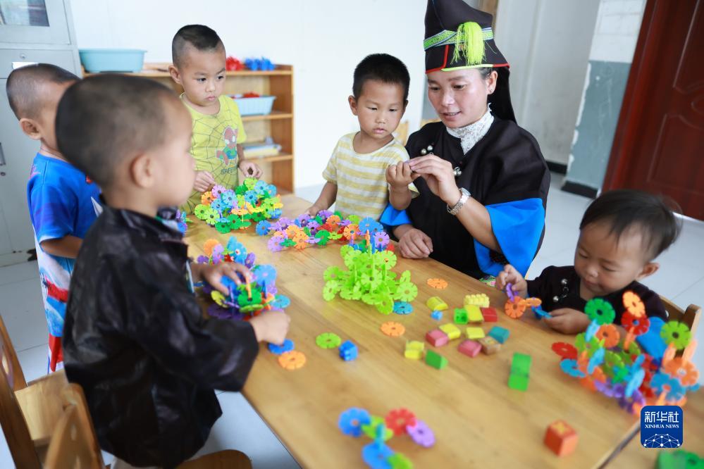 柳吉小學(xué)教師王章艷陪學(xué)生一起玩玩具(9月7日攝)。
