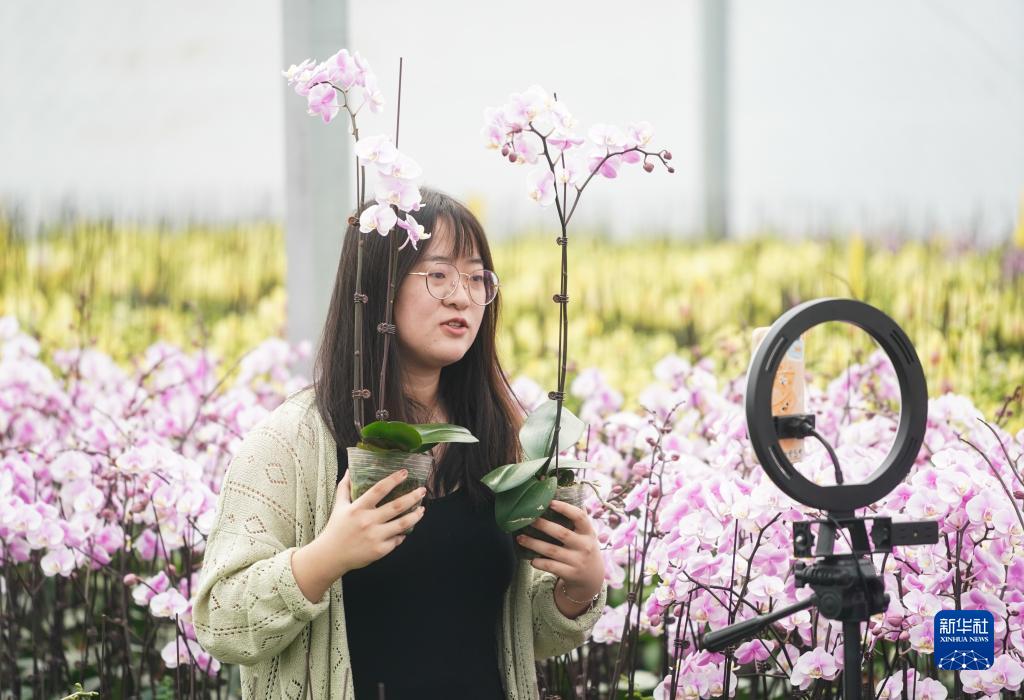 9月9日,工作人員在宿遷市王官集鎮蝴蝶蘭大世界大棚內進(jìn)行網(wǎng)絡(luò )直播。
