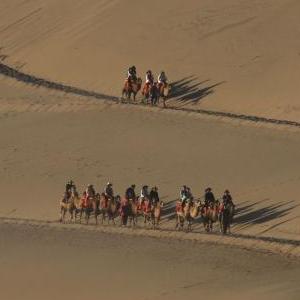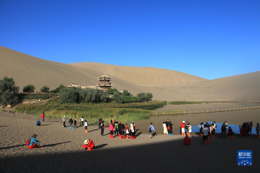 9月9日,游客在甘肅省敦煌市鳴沙山月牙泉景區游覽。