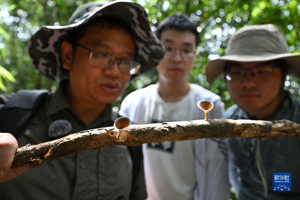 9月5日,曾念開(kāi)和學(xué)生在海南鸚哥嶺熱帶雨林觀(guān)察一截枯木上的相鄰小孔菌。