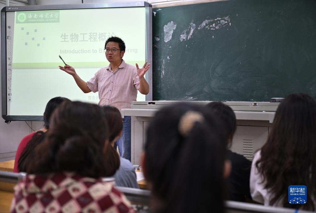 9月7日,曾念開(kāi)(右)在海南師范大學(xué)給學(xué)生上課。