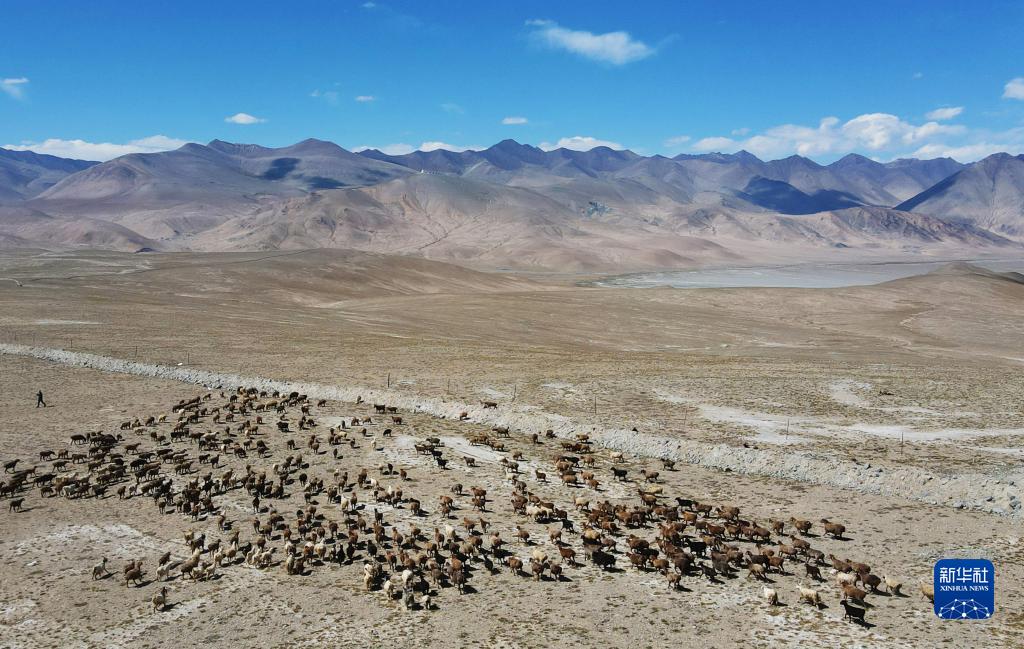 在位于塔合曼鄉境內的一片天然草場(chǎng)上,一群羊在低頭吃草(無(wú)人機照片,9月6日攝)。