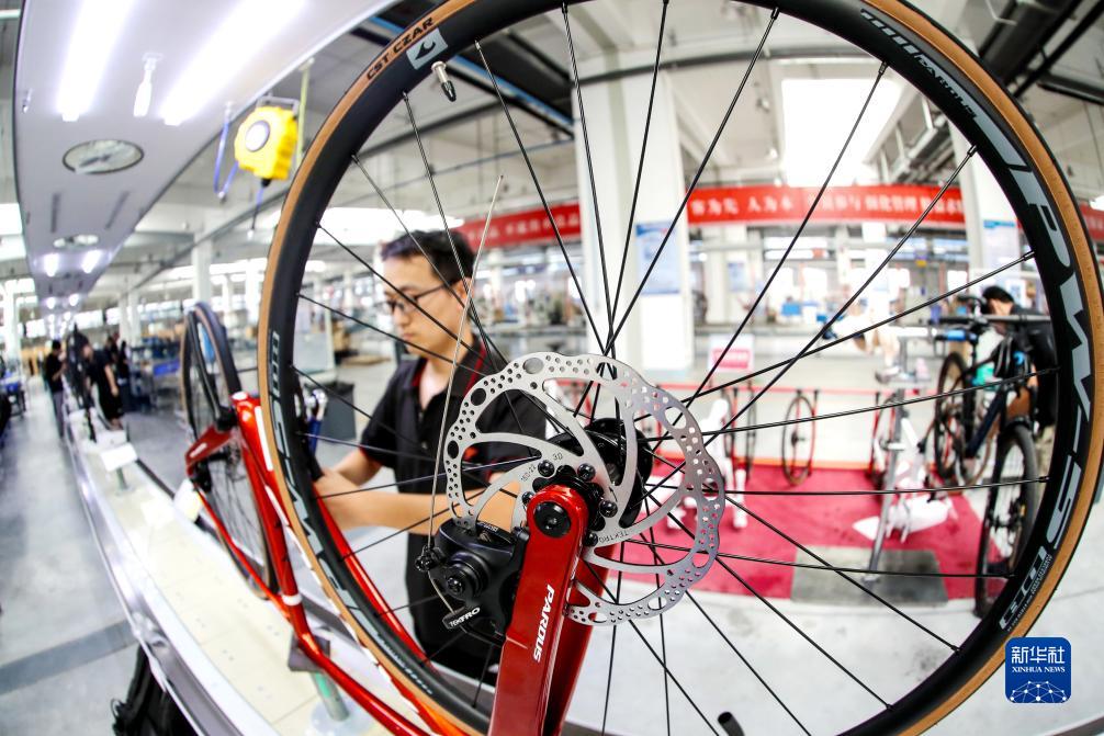 9月9日,在山東樂(lè )陵市一家企業(yè)的碳纖維自行車(chē)生產(chǎn)車(chē)間,質(zhì)檢員在組裝線(xiàn)檢驗自行車(chē)產(chǎn)品。新華社發(fā)(張進(jìn)剛 攝)