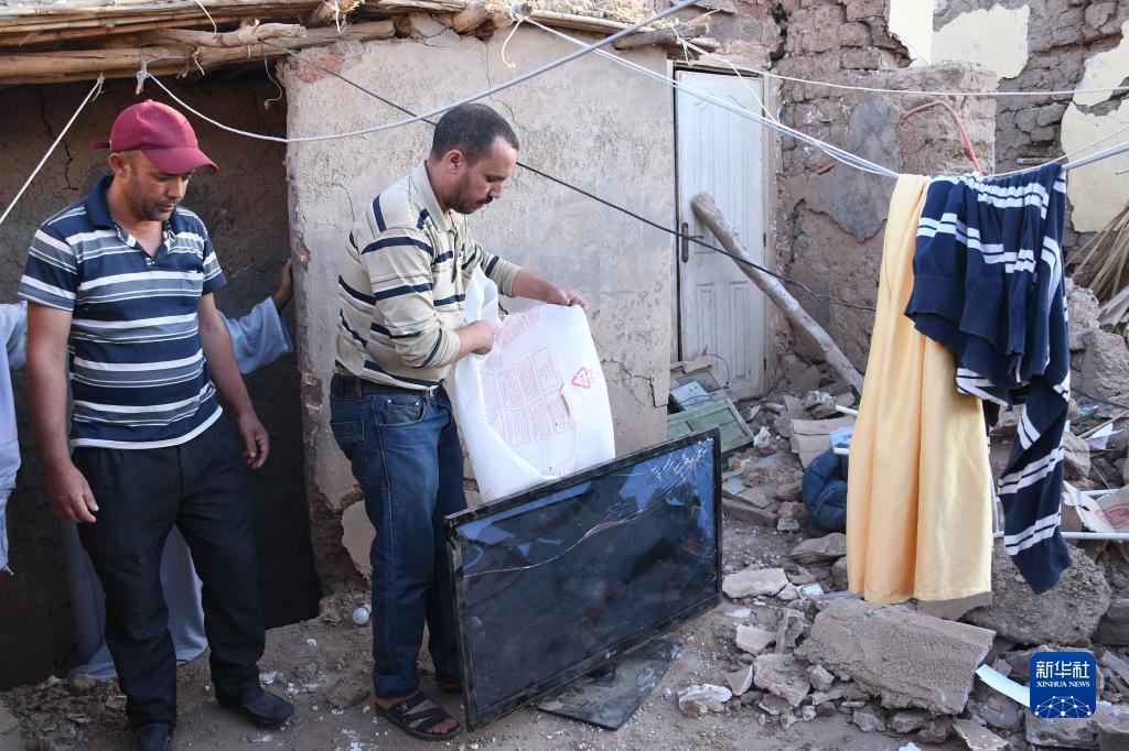 9月9日,在摩洛哥馬拉喀什附近,居民整理遭地震損毀的個(gè)人物品。