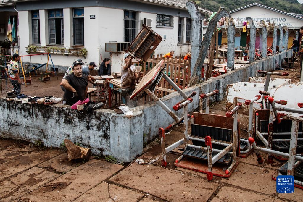 9月9日,人們在巴西南里奧格蘭德州穆孫市的一所學(xué)校參與清理工作。