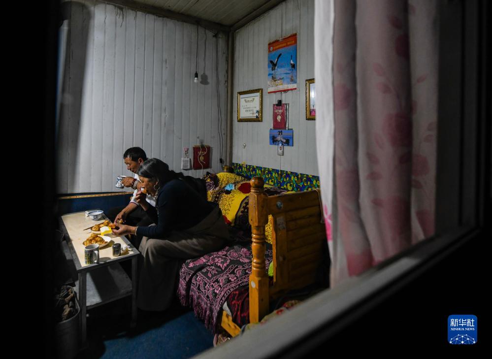 在四川省阿壩藏族羌族自治州若爾蓋縣花湖,濕地生態(tài)管護員如科和妻子納么姐在居住的小屋內吃晚飯(8月22日攝)。