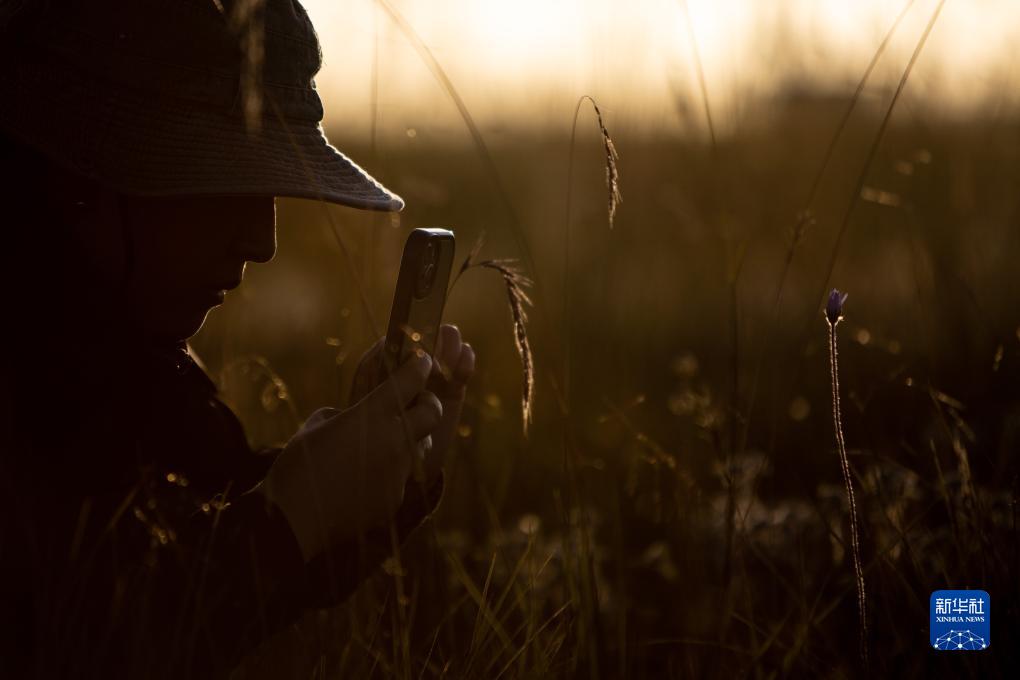 四川省阿壩藏族羌族自治州若爾蓋濕地國家級自然保護區管理局科研科工作人員卓瑪姐在花湖拍攝記錄當地植物(8月22日攝)。