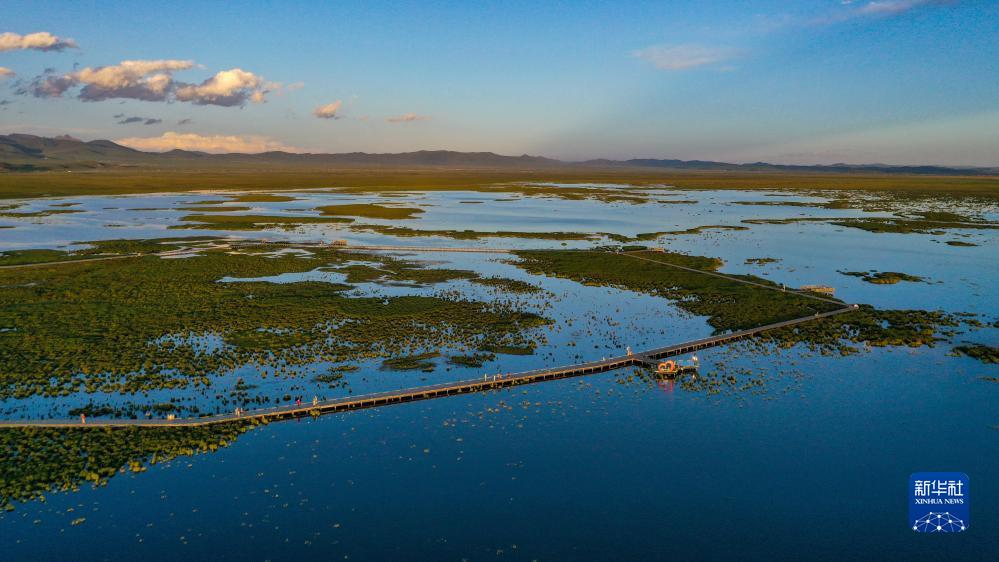 這是8月22日在四川省阿壩藏族羌族自治州若爾蓋縣拍攝的花湖棧道(無(wú)人機照片)。