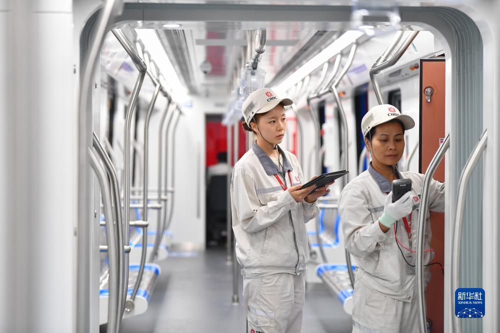 中車(chē)株機公司工作人員在中國中車(chē)出口墨西哥城輕軌列車(chē)首列車(chē)內巡檢(9月9日攝)。