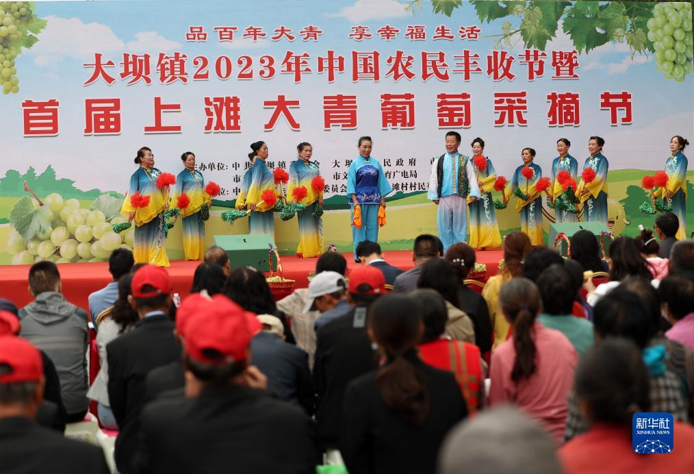 當日,寧夏青銅峽市大壩鎮2023年中國農民豐收節暨首屆上灘村大青葡萄采摘節在大壩鎮上灘村舉行。據了解,依托黃河灌區優(yōu)良的沙質(zhì)土壤和黃河水的灌溉等優(yōu)勢,當地農戶(hù)種植大青葡萄430多畝,葡萄種植產(chǎn)業(yè)已成為當地農民致富增收的“香甜產(chǎn)業(yè)”。