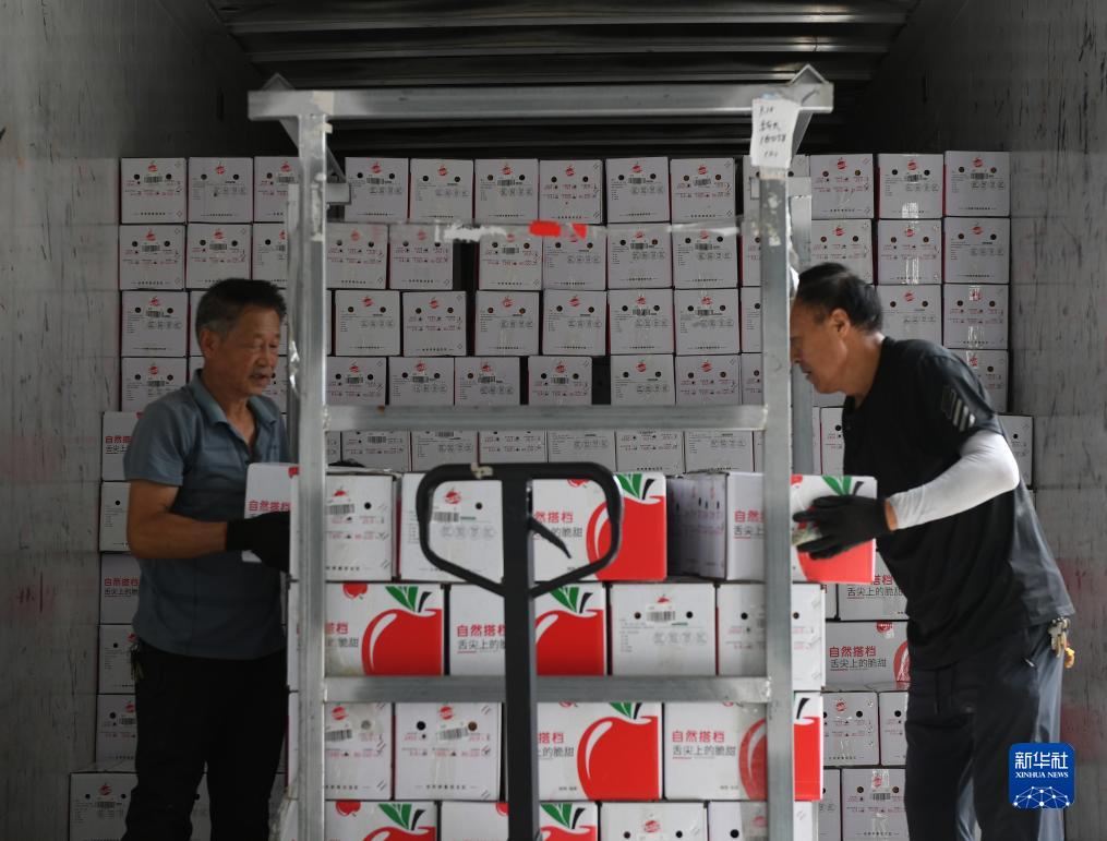 9月10日,在洛川蘋(píng)果現代產(chǎn)業(yè)園,工作人員將已裝箱的蘋(píng)果裝車(chē)。
