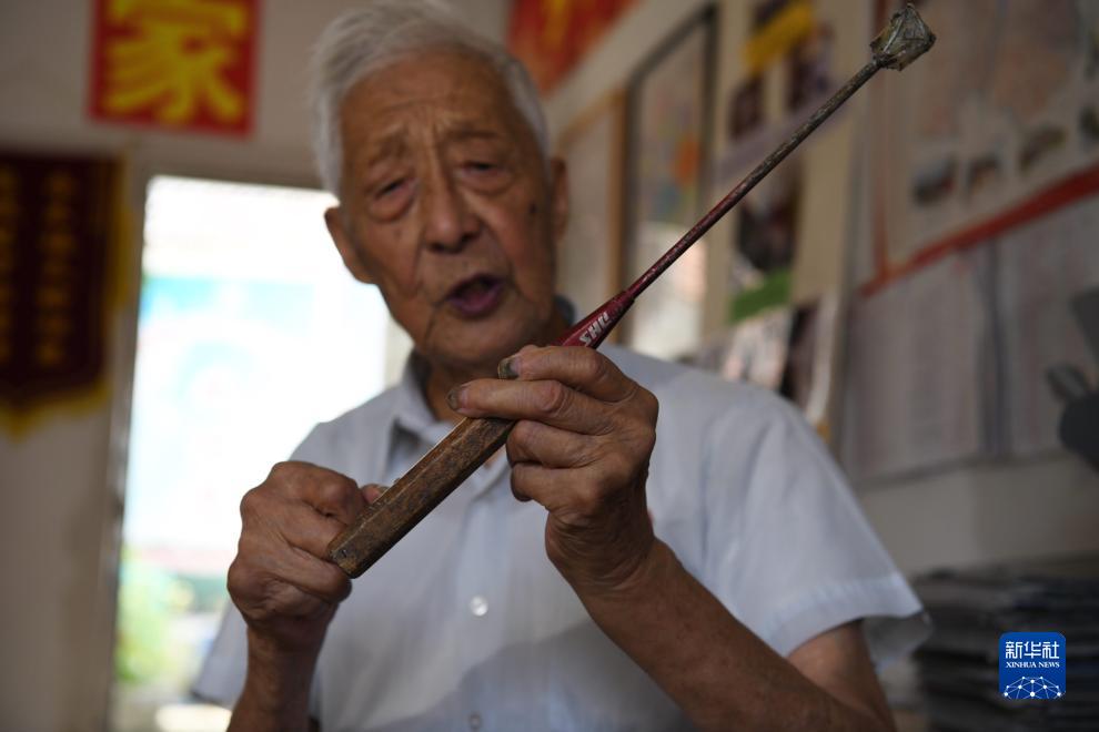 9月8日,在安徽省馬鞍山市和縣烏江鎮卜陳村的“留守未成年人之家”,葉連平介紹他使用多年的教鞭。這是一支由廢舊羽毛球拍制成的教鞭。