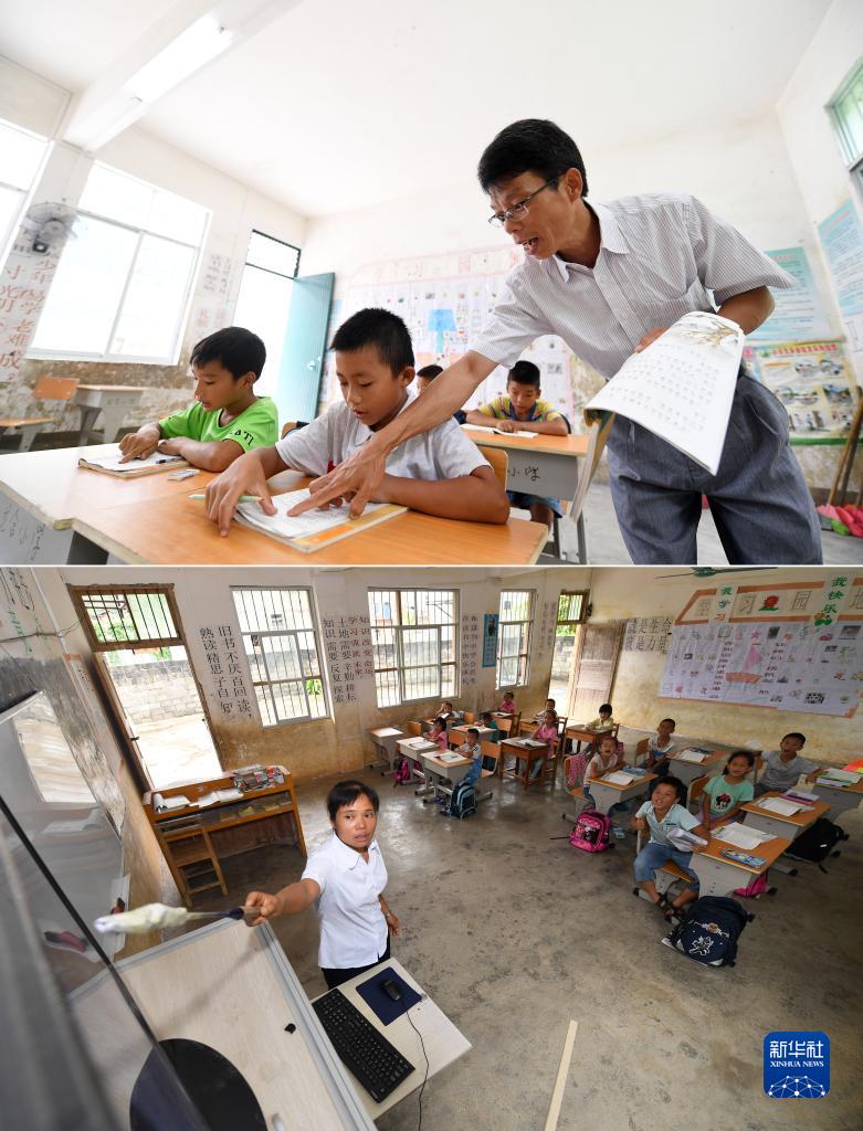 拼版照片:廣西天等縣進(jìn)遠鄉進(jìn)遠村龍含教學(xué)點(diǎn)的農志鵬老師給學(xué)生上課(上圖),廣西天等縣進(jìn)遠鄉進(jìn)遠村龍堅教學(xué)點(diǎn)的梁碧瑩老師給學(xué)生上課(下圖)(2017年9月7日攝)。2017年,農志鵬和梁碧瑩是廣西天等縣大山里一對夫婦教師,農志鵬是龍含教學(xué)點(diǎn)唯一的老師,梁碧瑩是龍堅教學(xué)點(diǎn)唯一的老師,兩個(gè)教學(xué)點(diǎn)之間被兩座大山阻隔,來(lái)往不便,他們一家常常只有周末才能團聚。