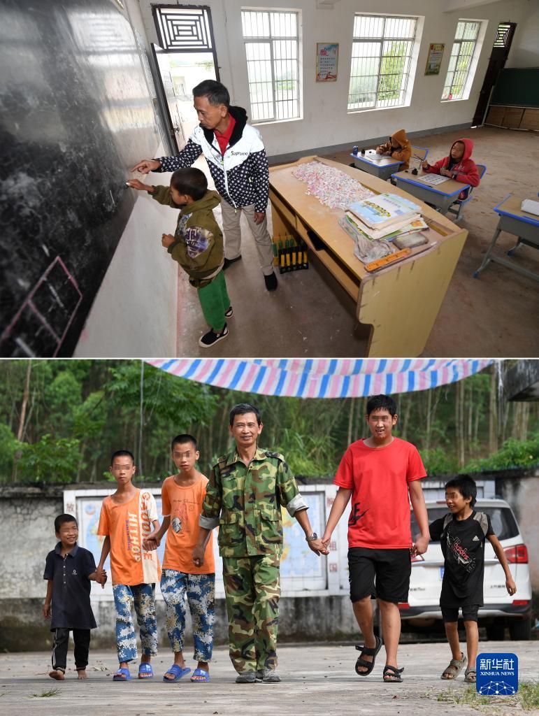 拼版照片:廣西上思縣那琴鄉中心小學(xué)逢通村教學(xué)點(diǎn)的梁志雄老師給學(xué)生上課(上圖,2019年11月19日攝),梁志雄老師和學(xué)生課后走在校園里(下圖,2021年6月16日攝)。梁志雄老師2005年被調到那琴鄉中心小學(xué)逢通村教學(xué)點(diǎn),這里到2017年僅剩梁志雄和三名殘障學(xué)生。2020年8月,梁志雄老師光榮退休。但三名殘障學(xué)生無(wú)法升學(xué)到其他學(xué)校就讀,梁志雄接受返聘繼續留守。2021年2月,逢通村教學(xué)點(diǎn)又來(lái)兩名殘障學(xué)生,這個(gè)教學(xué)點(diǎn)成了梁志雄老師和5個(gè)殘障學(xué)生“一師五生”的學(xué)校。