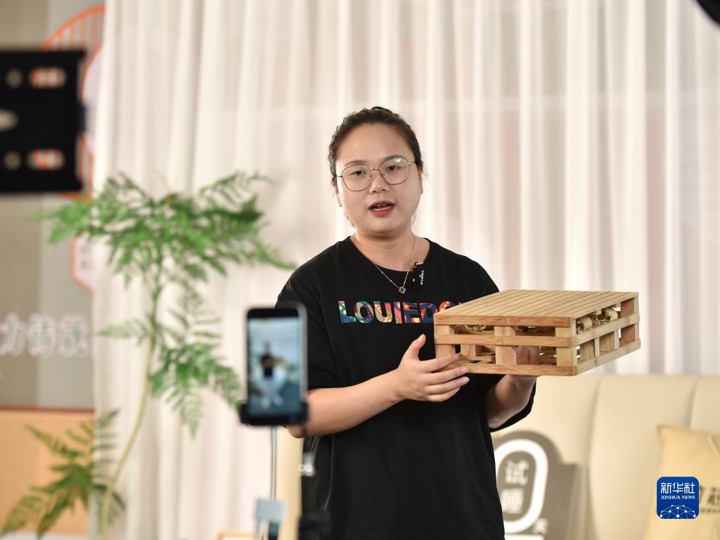 9月10日,在湖南省婁底市雙峰高新區一竹制品生產(chǎn)企業(yè),銷(xiāo)售人員在直播介紹竹芯床墊小樣。