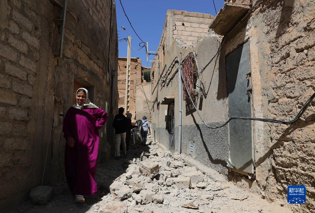 9月10日,在摩洛哥震中附近的艾米茲米茲村,人們從受損建筑旁經(jīng)過(guò)。