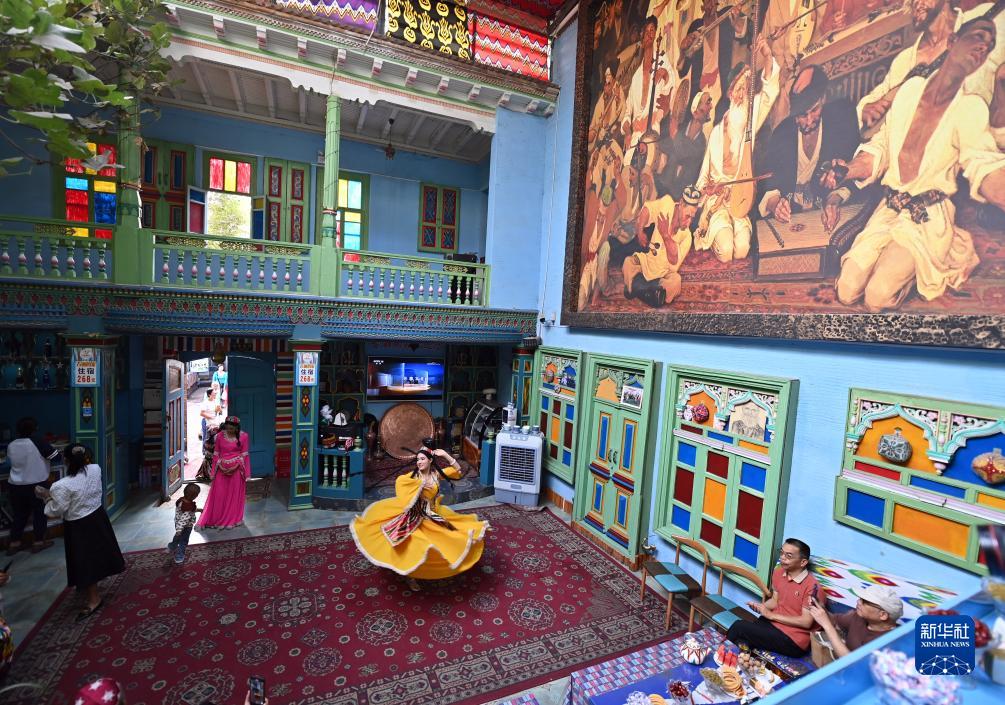 在新疆喀什古城景區“古麗的家”旅游家訪(fǎng)點(diǎn),演員在隨音樂(lè )起舞(9月7日攝)。