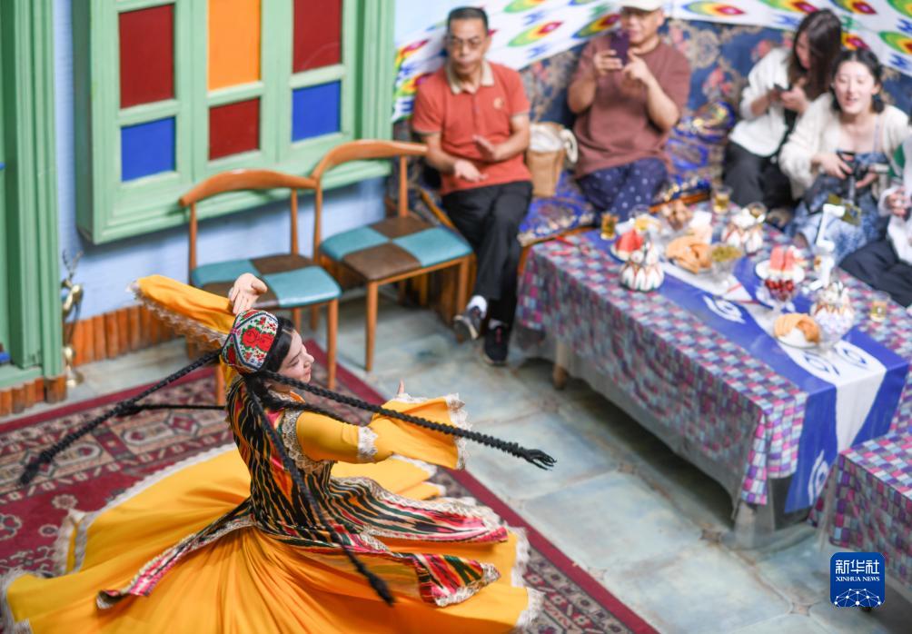 在新疆喀什古城景區“古麗的家”旅游家訪(fǎng)點(diǎn),演員在隨音樂(lè )起舞(9月7日攝)。