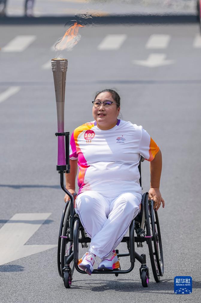 9月11日,火炬手婁小仙在火炬傳遞中。