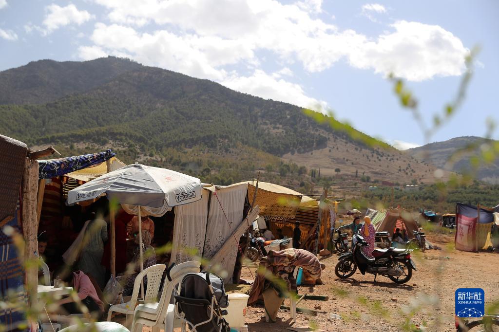 這是9月10日在摩洛哥震中附近的艾米茲米茲村拍攝的一處臨時(shí)安置點(diǎn)。