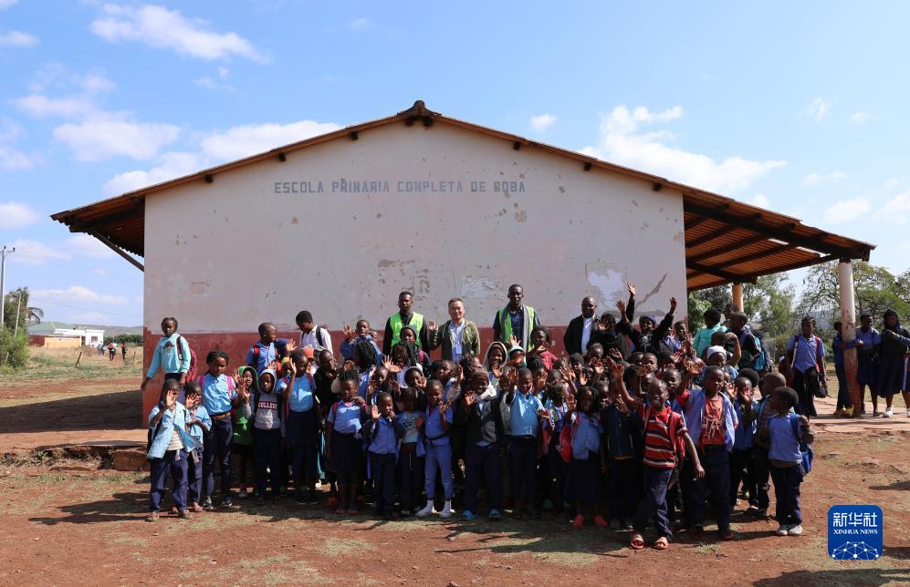 7月26日,瓜達吉亞和同事在莫桑比克馬普托省戈巴村學(xué)校與師生合影。