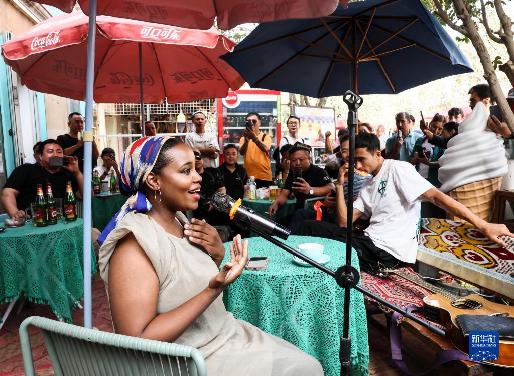 海迪雅在自家咖啡館前唱歌(9月7日攝)。