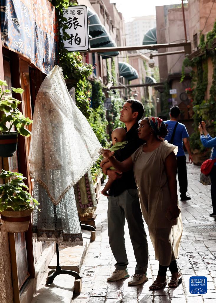迪力夏提抱著(zhù)孩子和海迪雅走在喀什古城景區的巷道內(9月7日攝)。