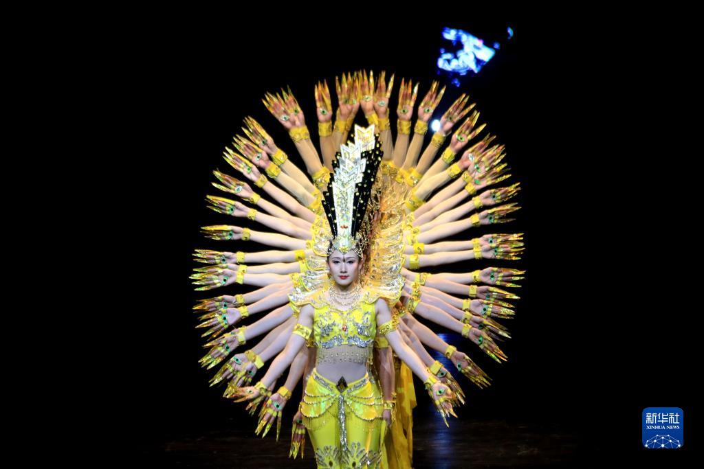 9月10日晚,在甘肅敦煌大劇院,演員在大型情景音畫(huà)劇《千手千眼》中表演。
