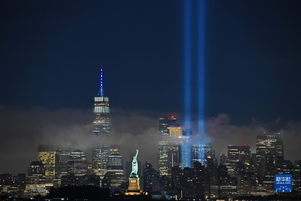 9月11日晚,美國紐約世貿中心遺址附近亮起象征紐約世貿中心“雙子塔”大廈的光柱,紀念“9·11”恐怖襲擊事件二十二周年。