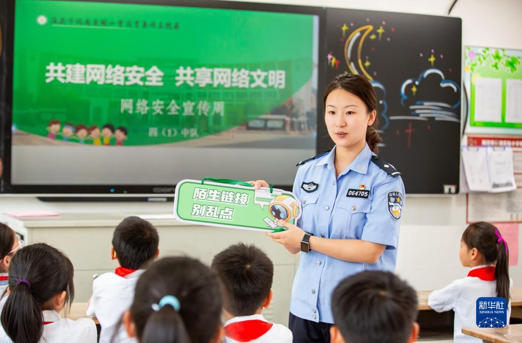 9月11日,在江蘇省海安經(jīng)濟開(kāi)發(fā)區實(shí)驗小學(xué),海安市公安局城東派出所民警在給小學(xué)生普及網(wǎng)絡(luò )安全知識。