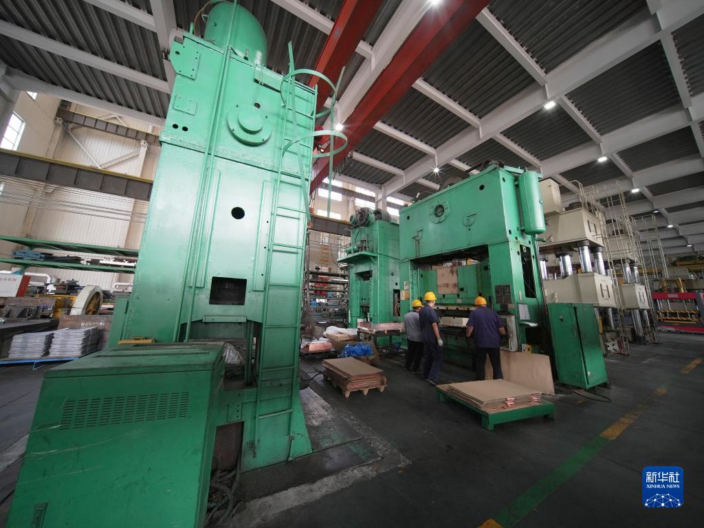 9月12日,工作人員在滄州惠邦機電產(chǎn)品制造有限公司生產(chǎn)車(chē)間使用壓力機對新能源汽車(chē)配件進(jìn)行沖壓。