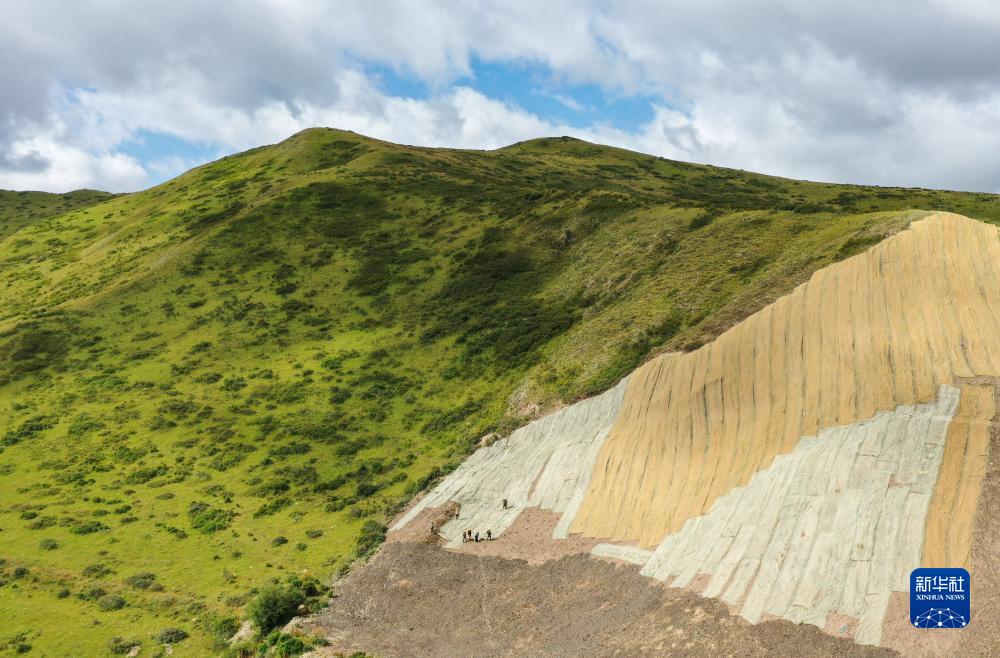 在若爾蓋縣達扎寺鎮多瑪村廢棄礦山治理點(diǎn),工人在邊坡上鋪椰絲毯(8月23日攝,無(wú)人機照片)。