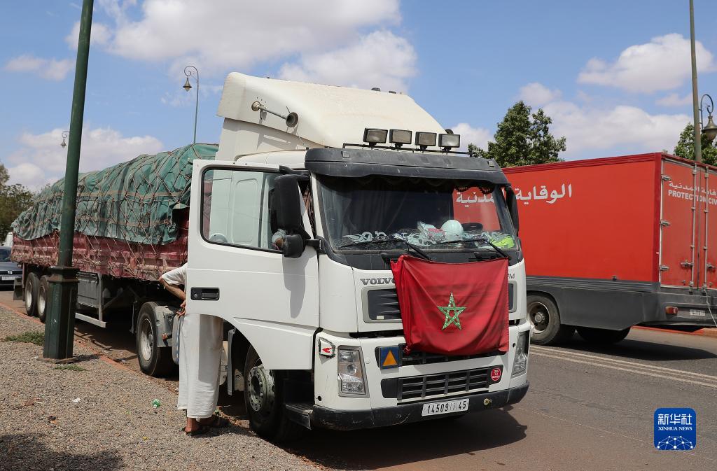 9月12日,裝載救援物資的貨車(chē)在摩洛哥豪茲省的穆萊村???。
