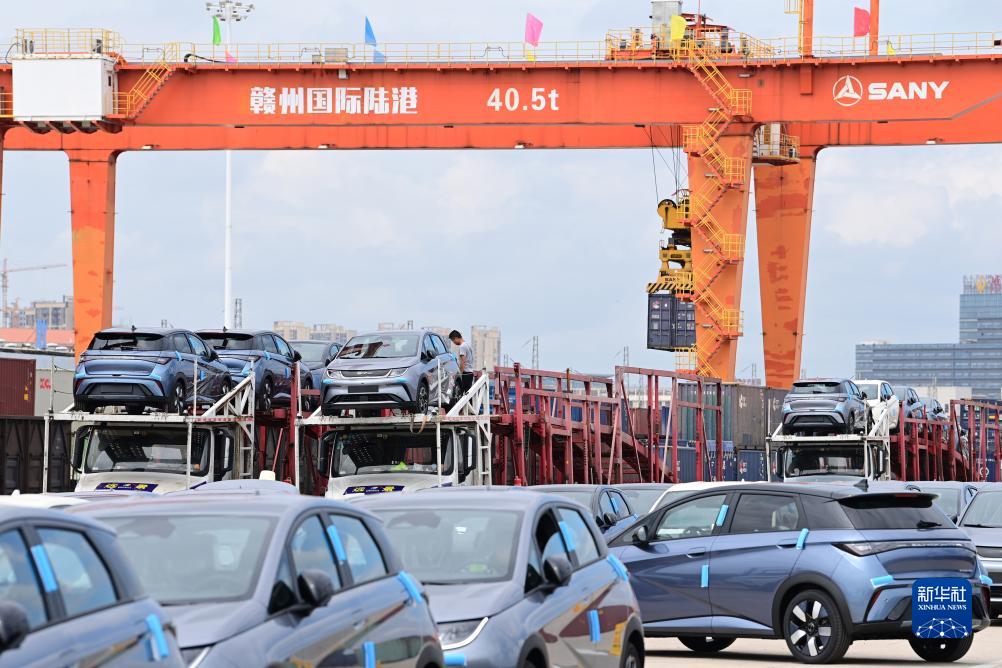 9月13日,在江西贛州國際陸港,新能源汽車(chē)排列等待裝車(chē)發(fā)運。