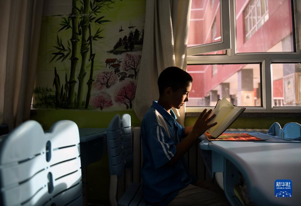 9月7日,在新疆喀什第二中學(xué),拉齊尼的兒子拉迪爾·拉齊尼在收到老師送他的新學(xué)年禮物時(shí),撫摸著(zhù)嶄新的筆記本。新華社記者 王菲 攝