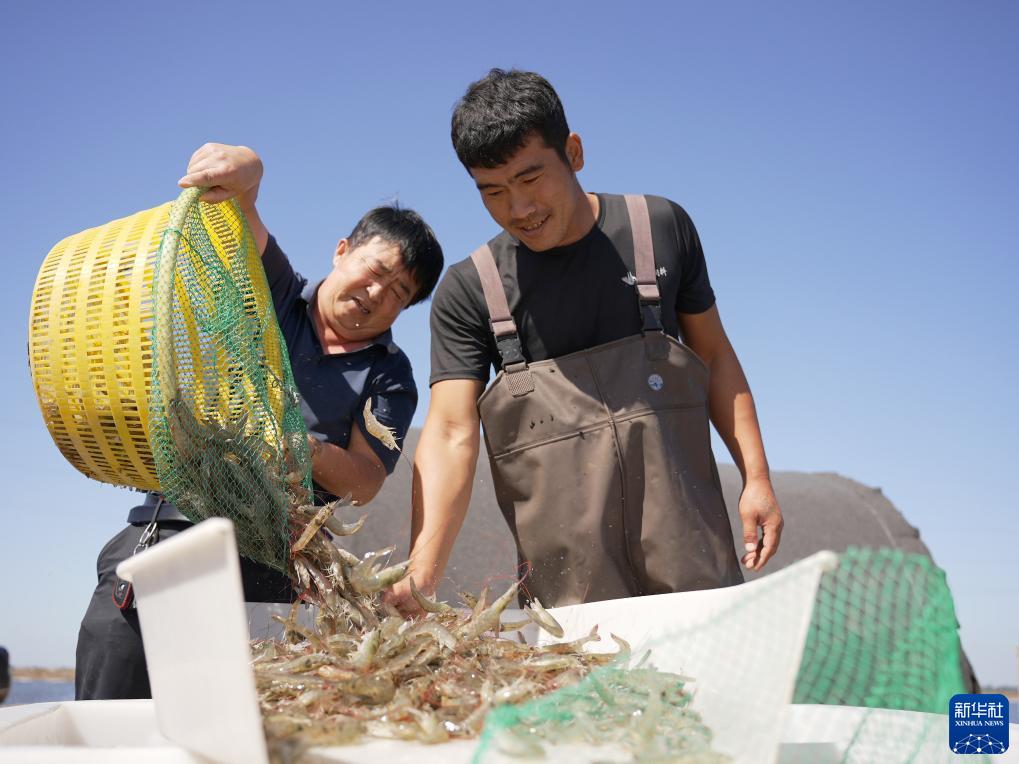 9月13日,養殖戶(hù)在河北省滄州市海興縣小山鄉蔡家莊村養殖蝦池分揀對蝦。