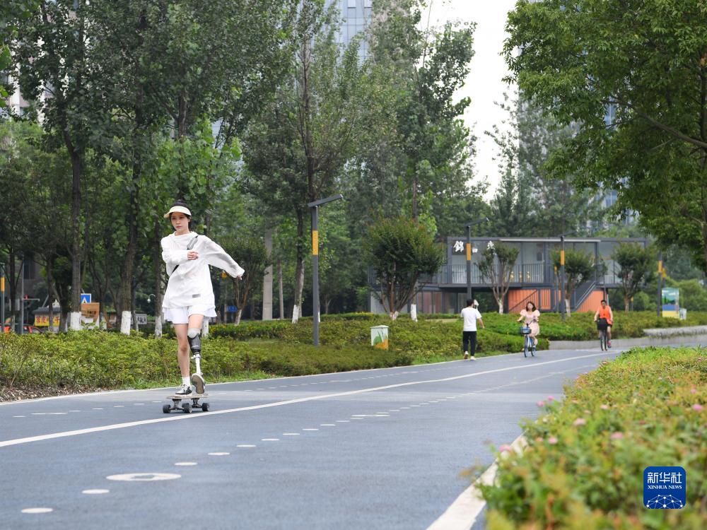 胡月在成都市錦江區城市綠道練習滑板(6月20日攝)。新華社記者 王曦 攝
