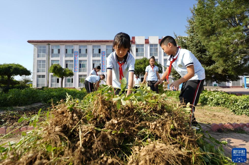 9月13日,河北省樂(lè )亭縣汀流河小學(xué)的學(xué)生在“校園農場(chǎng)”內收獲花生。