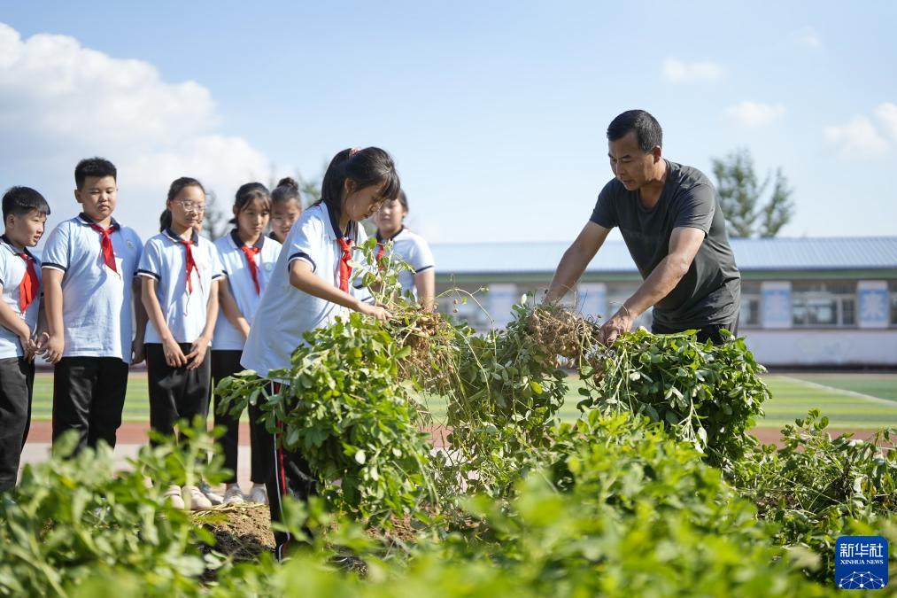 9月13日,河北省樂(lè )亭縣汀流河小學(xué)的老師在“校園農場(chǎng)”內指導學(xué)生收獲花生。