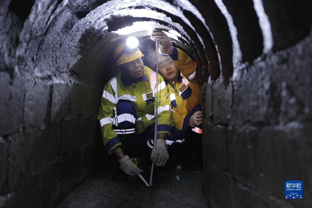 9月13日,在大興安嶺地區白卡爾隧道,中國鐵路哈爾濱局集團有限公司加格達奇工務(wù)段的鐵路工人在地下8米的深井檢查排水系統的暢通情況。